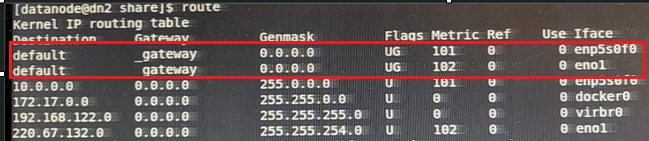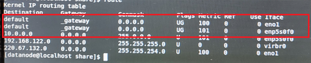 여기서 Metric 값을 보면 10G 네트워크인 enp5s0f0가 eno1보다 Metric이 작은 것을 알 수 있다.